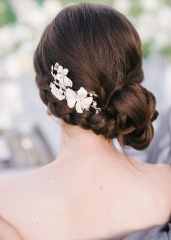 - Weave the strands on the temples in braids, directing the weaving to the back of the head, fix with an elastic band, connecting both braids at the ends. Around them to wind a graceful bundle of the rest of the hair, to give the desired shape, secure with hairpins.
