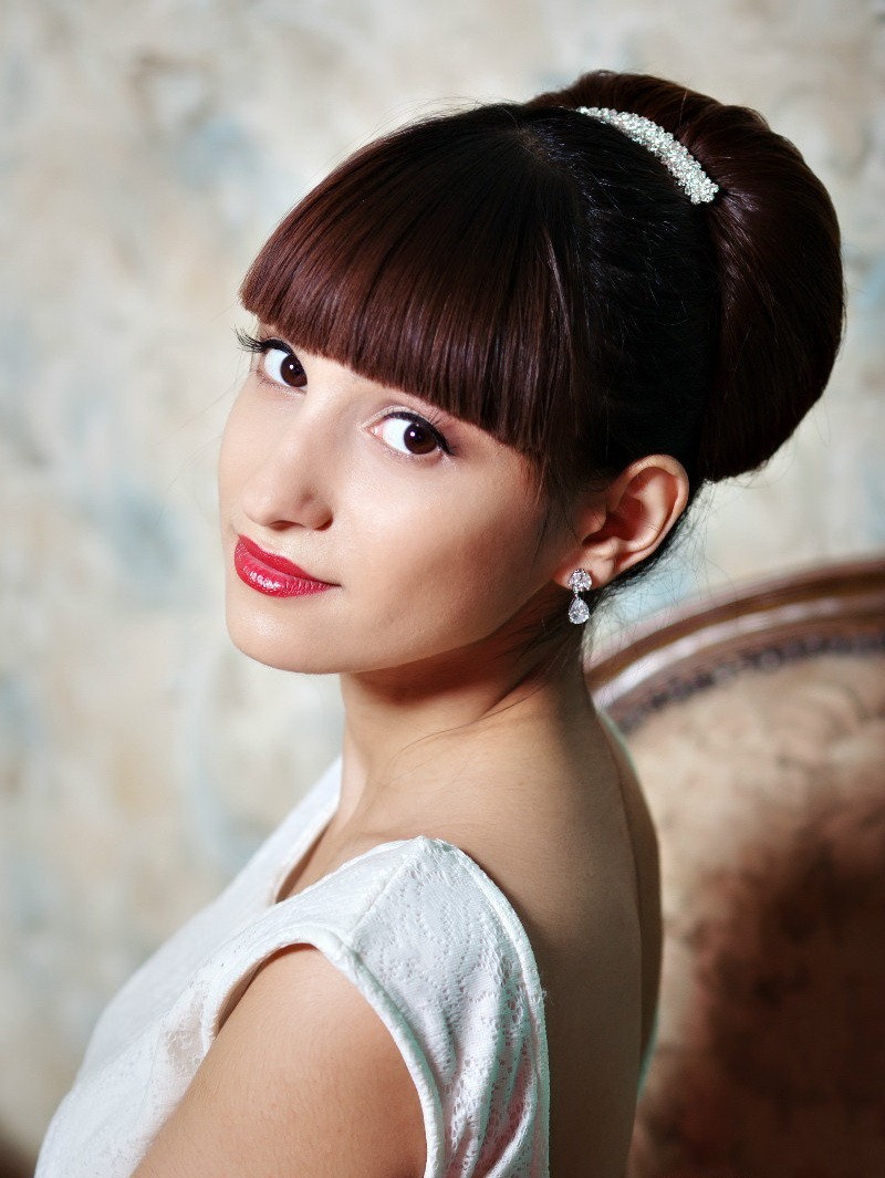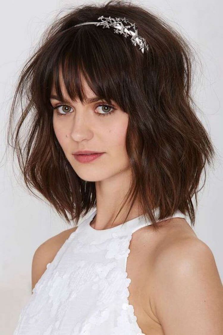 The hair can be laid in a different way, leaving it loose or lifting it up with loose playful strands. With a bang, the image gets complete. Depending on its shape, it may vary. Bangs are:
