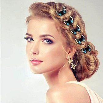 Styling, in which there is weaving, looks appropriate both in the afternoon and in the evening. Of course, for such hairstyles in the first place you need the length of hair. Bangs can either be or be absent.To create a hairstyle, it takes 5-10 minutes, but the hair must be well-groomed and prepared. To create volumetric weaving you need: