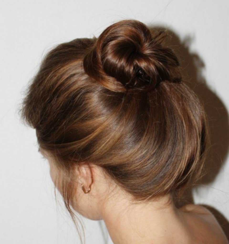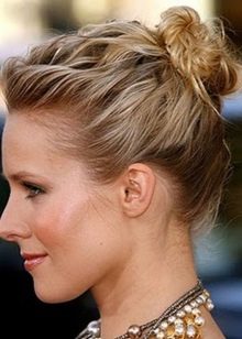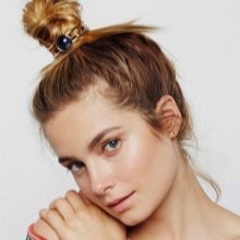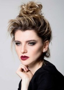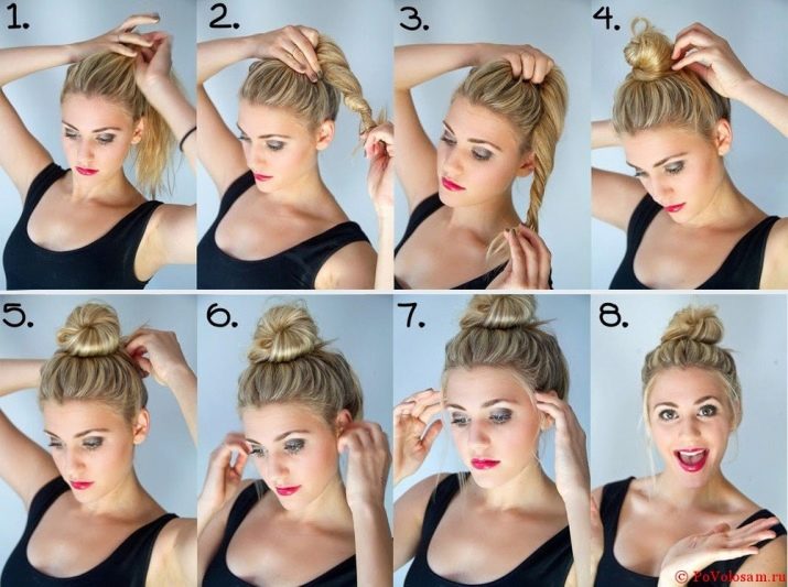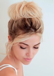 To do a natural bun best on long and medium hair. On the short head of hair, it will not look so nice and volumetric. This hairstyle implies both a high beam at the crown and a low one at the back of the head.