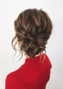 We collect figuratively clean hair in the tail at the back of the head and twist the strands into a tight braid. Next, tie the ends of the hair into a knot and pull them out of the bun, and then hide them "down". Such styling is best done on the hair, the washing of which took place the day before, otherwise the hair will “crumble”.