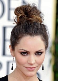 The disadvantages of the natural beam include its “fragility”. Clean strands that are not fixed by studs can quickly "break out" of styling. Therefore, the beam can be varnished or, in addition to the elastic, fixed with a satin ribbon. In addition, the owners of the haircut cascade will not be able to make a bundle of the entire head of hair, since it will not work out to collect all the strands of different lengths “at once” They will have to use "invisible" or hairpins. Also, beams on the top are not suitable for young ladies and women with massive cheekbones and chin.