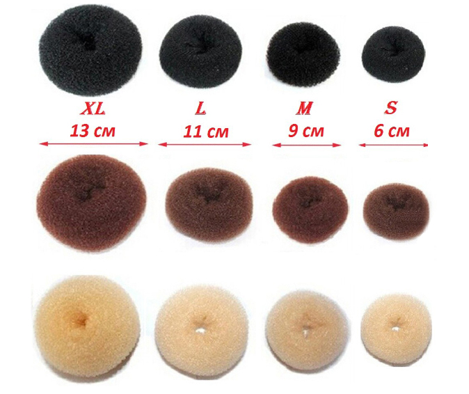 The diameter of the roller will also determine how tightly it fits to the head and how firmly it is held in the hairstyle. The larger the ring where you want to miss the hair, the weaker the fixation will be, and vice versa, the smaller the ring, the closer the hair will be pressed together, and the stronger they will press the bagel to the head, fixing it much stronger.