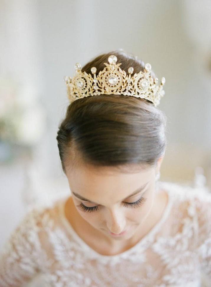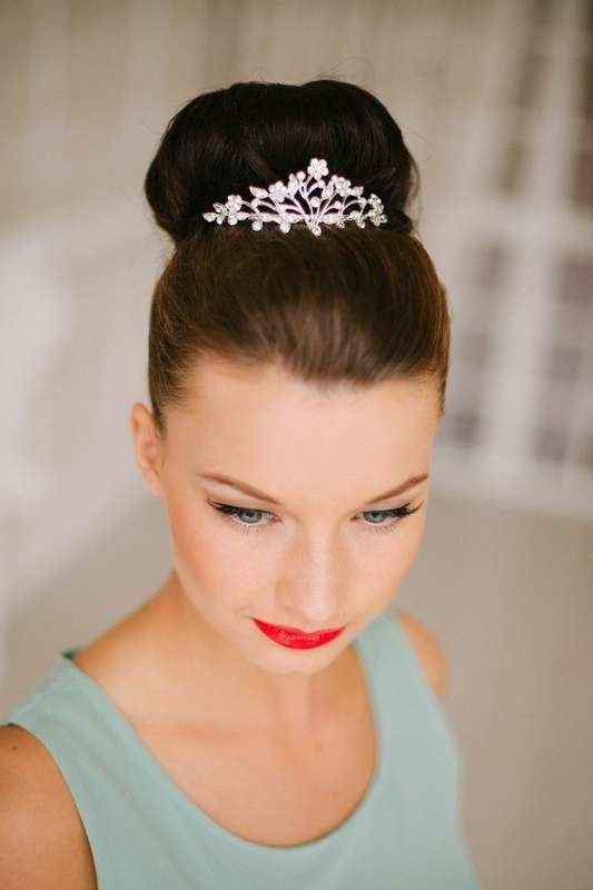 If you need a hairstyle for a festive event, then you can beat the bun with a tiara or metal rim, decorated with stones or metal patterns and casting.Thin metal headbands, decorated with rhinestones, look very nice on the hair.
