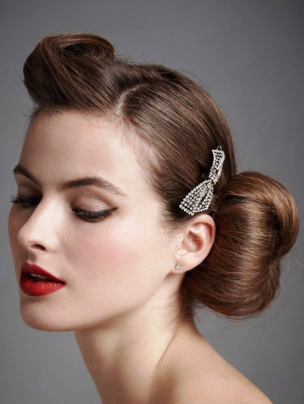 A rather popular decoration on a sleek bundle - hairpins with large ornaments (for example, in the form of flowers, stars, animals, and other objects, the options are too diverse to even list most of them). Smooth hair and a bright hairpin, sparkling in the sun - and you get a beautiful image.