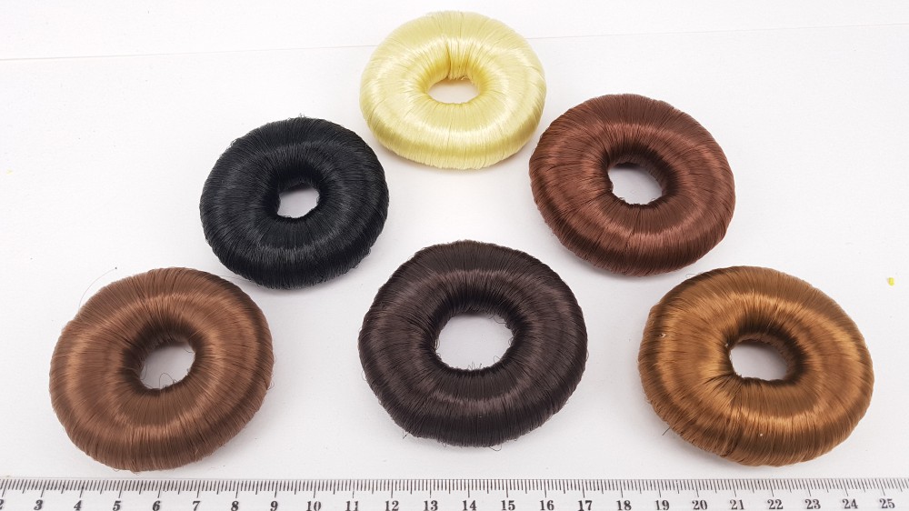 Bagels with hair are an excellent option for situations where natural hair is not enough or barely enough to hide the base of the beam. Bagels of this type on top of the main soft material are covered with artificial hair that can be matched to your natural color. This type of donut can also be used to create complex hairstyles, when it is necessary not only to lift a part of the hair, but also leave enough to create a fluffy lower part (for example, loose curls).