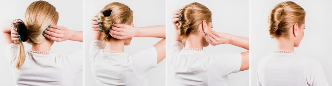 - Next, they must be collected in the tail at the back of the head, but without fixing the rubber band. Curls along the entire length will need to be twisted with a braid and make a cushion of them, twisting in one direction. The ends for a neat appearance and fixation should be hidden inside, fixing hairpins if the hair is too long. On the average hair can be used several invisible. To keep short hairs from sticking out of hair, they need to be smoothed with hands, sprinkling the entire styling with varnish.