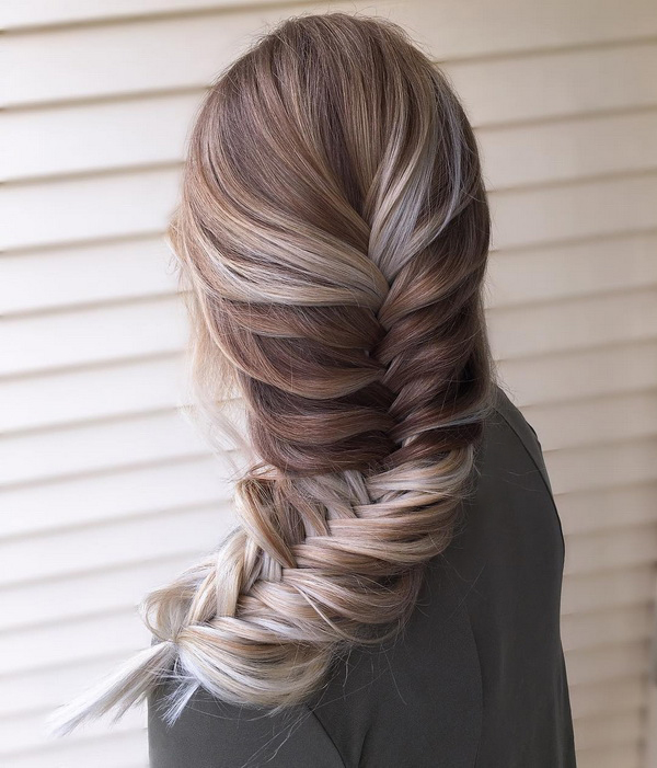 - This type of hairstyle is perfect for all the fair sex, no matter what age they are. Moreover, the "fish tail" is ideally combined with any hair color. But, of course, it should be noted that the most memorable hairstyles with braids are those that are woven on an ombre, gradient or habitual highlighting.