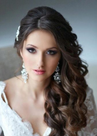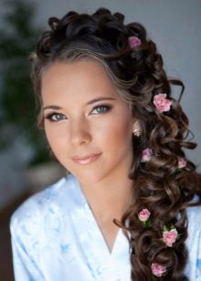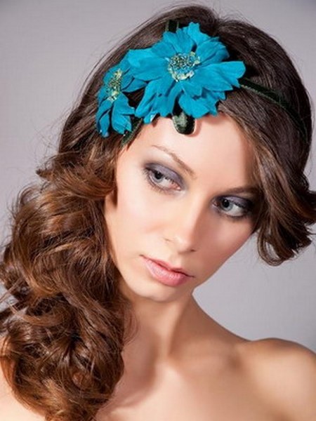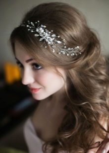 Trendy curls, gently tucked to the side, Look much more festive and brighter if they are supplemented with suitable accessories. Most often, young ladies to adorn their hairstyles resort to the use of charming headbands, pins, cute flowers. No less attractive and gently similar compositions with curls look, if you add them to rhinestones, multi-colored beads, feathers or tiaras.