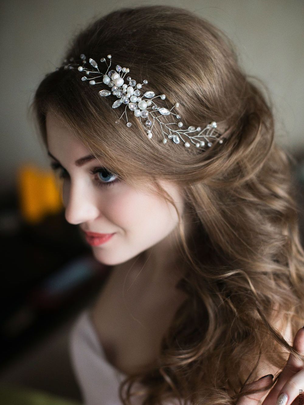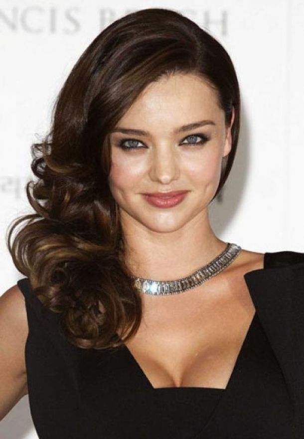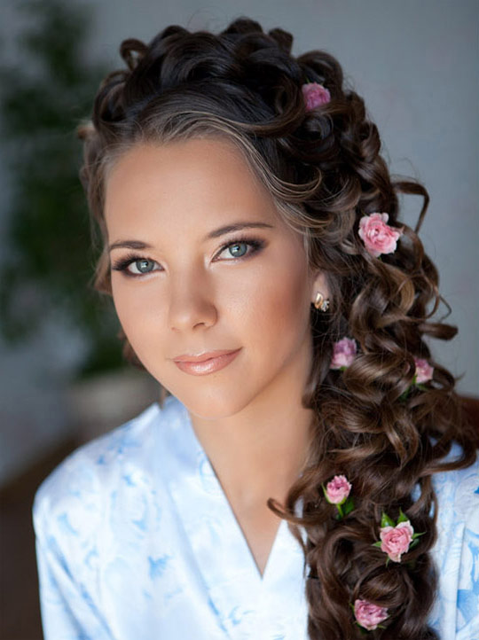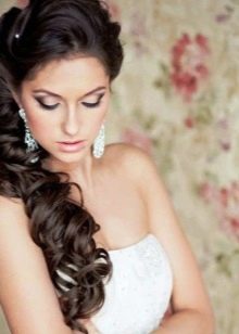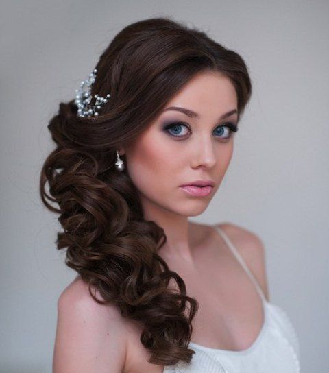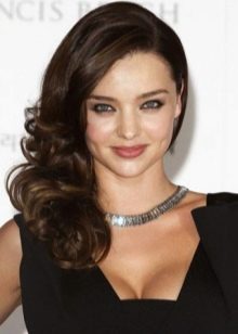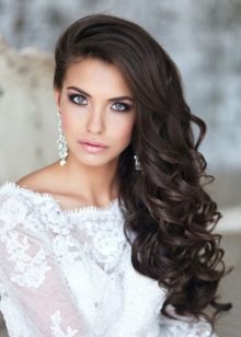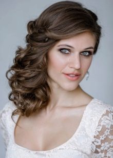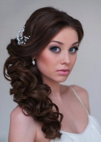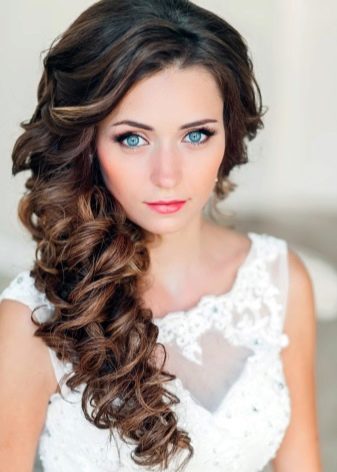 Since the curls in such hairstyles are thrown to one side chosen by the woman, an imitation of their spectacular density is involuntarily formed, in which you can easily hide almost any fasteners - invisible or barrettes. Do not be afraid to hide these details behind the curls - the image will not become overloaded from this.