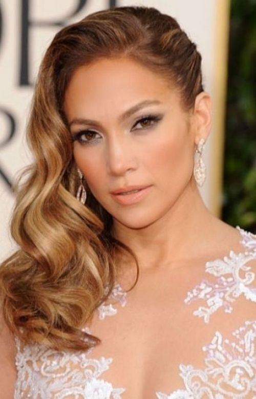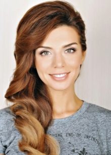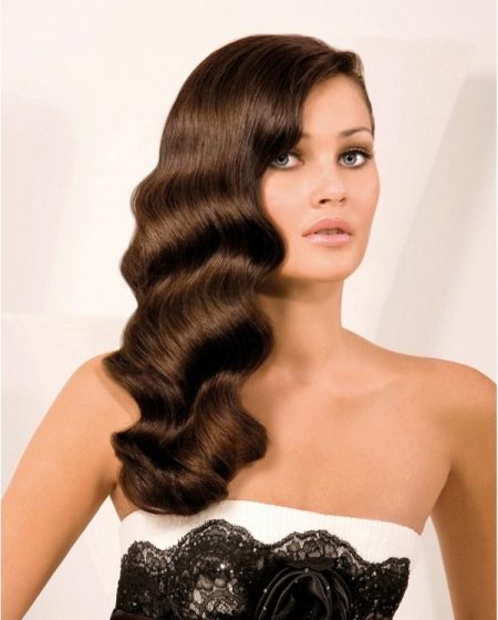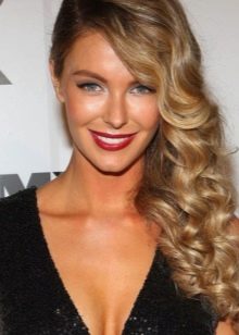The hairstyle with wavy large curls gathered from the whole head and then tucked away on one side looks amazing on girls and women. Particularly harmonious styling will look in tandem with oblique parting. But you need to keep in mind that in this case, the temporal part of the opposite side will be as open as possible.
