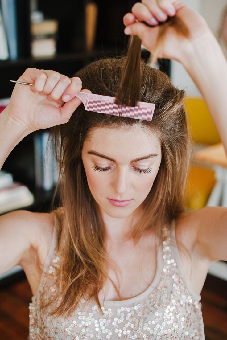 - First, the hair will need to be separated into zones, forming even partings. If you want, you can prepare a parting and pile up from the crown.