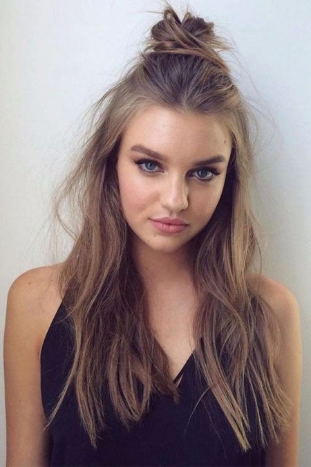 Creating such a hairstyle fits into one phrase - comb your hair and collect about half of it on top of your head in a sloppy bunch, the rest remain loose.