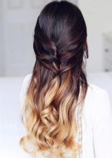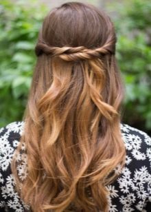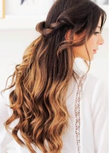 So, truly gorgeous and sexy on girls with long and curly loops at the ends look rims made of thick braids. This hairstyle will look especially attractive if the chic ladies' curls are painted using the technique of balayazh and combine dark and copper / honey shades.
