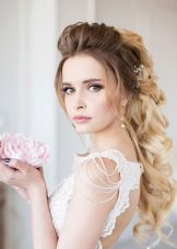 Another excellent option for a wedding celebration is a high-top Malvinka. To build it, the strands in the upper part of the head are pre-combed, turning over layer by layer. Due to this, the upper layer is effectively smoothed. Then the top of the stacks collected in the back of the head. At the end of the creation of hair, it is complemented by various decorative elements - hairpins, beads, flowers, twigs and other similar pleasant trifles.