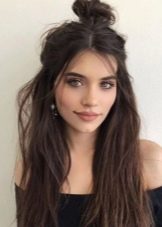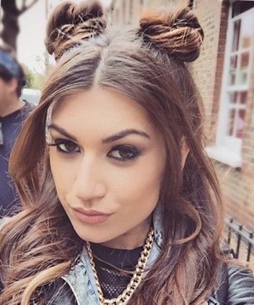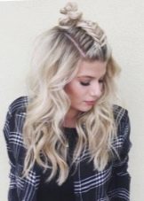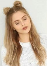 Original and unusual looks youth hairstyle, made in the form of two collected cones (bunches) at the top. The rest of the head of hair at the same time may be slightly twisted or straight.