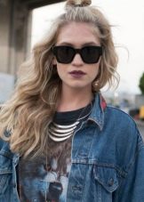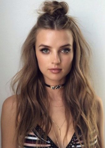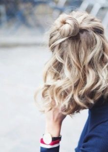 Beautiful and fashionable styling with loose curls can be built with their own hands and on a short head of hair. For example, on such a basis will look lovely flirty bun, It is unlikely that it will take more than 5 minutes to prepare. To make it all you need is to collect the upper curls, and then tie them in such a way that the tips remain in the rubber band. This means that it is not necessary to remove the hair completely from the tail.