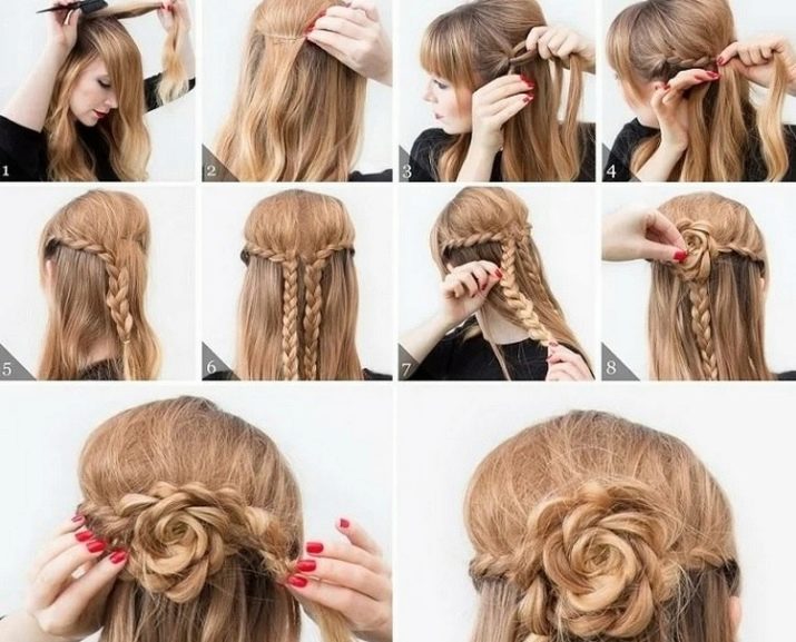 To make such an original hairstyle look as expressive and bright as possible, a beautiful hairpin can be fastened in the center of the rosette gathered from the braid.