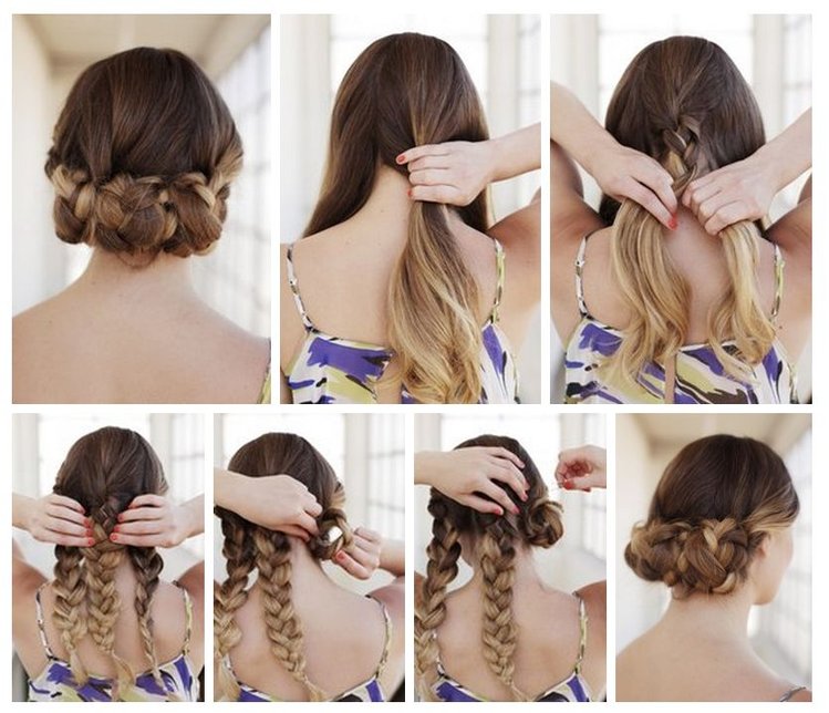 - One of the most difficult evening hairstyles for long hair is braid beam. It is often used in the images of brides or graduates. The main part of the hair is collected in the tail at the crown. At the same time, strands are left unassembled, of which the braids on the back of the head and on the sides of the head are subsequently woven. These braids may have different thickness and number of strands. Then all the hair is collected in a magnificent bundle and fixed. This hairstyle is good because you can create many of its various interpretations, experimenting with the number, location and thickness of braids.