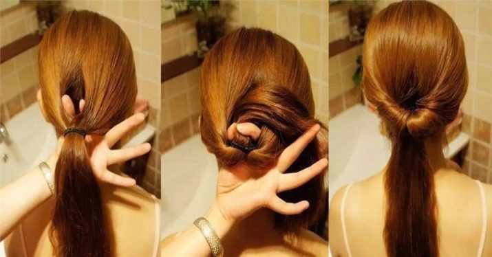 We collect hair in a low tail and we twist a bundle from it. Next, gently divide the hair above the gum into 2 parts and push into the hole formed a tourniquet. Reversed tail slightly pulled down, and the ends are either combed or curled.