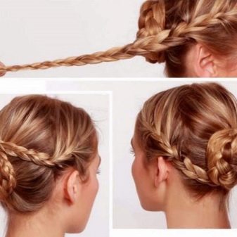- All 3 pigtails raise and form one common beam at the back of the head. We fasten the studs, fix, decorate.