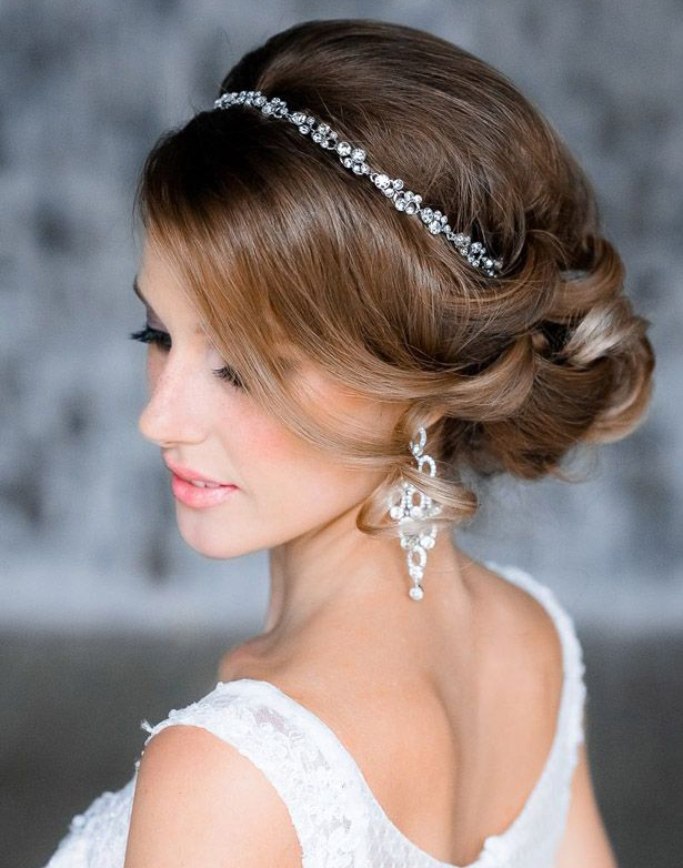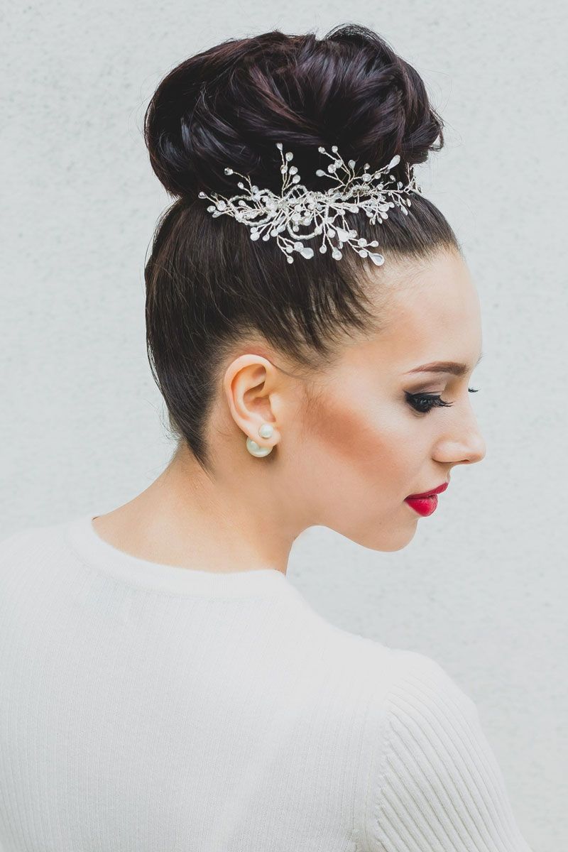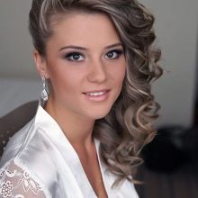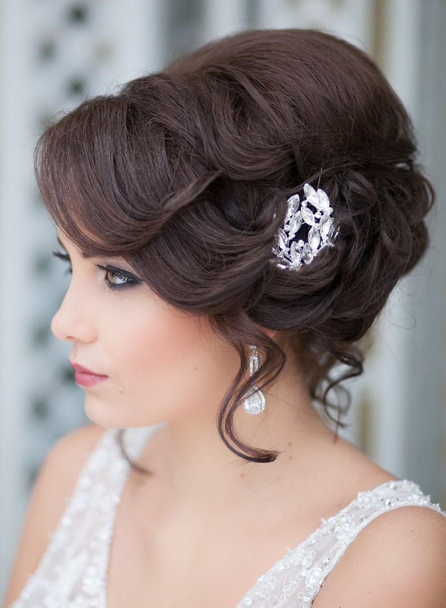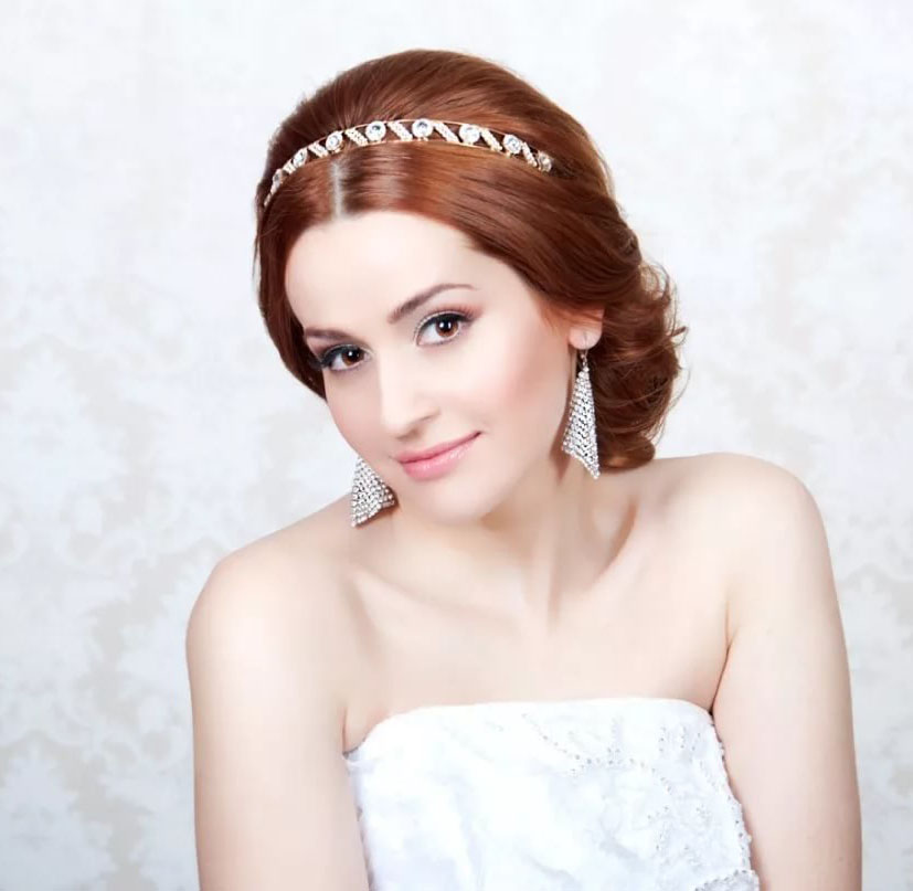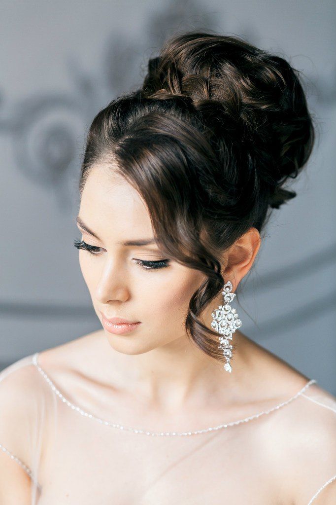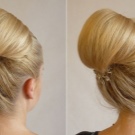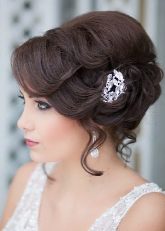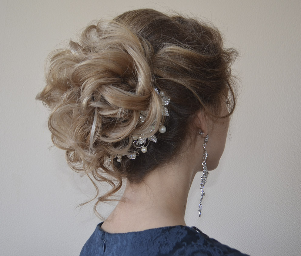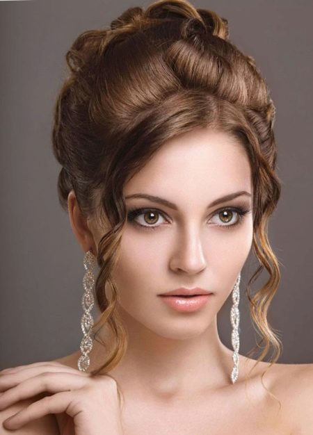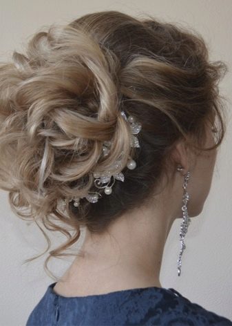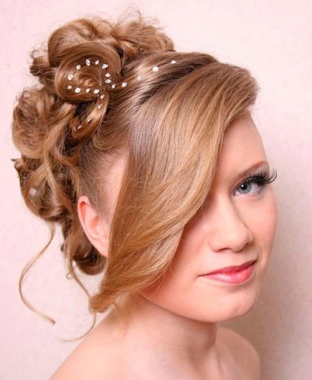 Pretty spectacular styling, emphasizing the femininity of its owner. Feels peculiar lightness and smoothness. A bunch carefully gathered at the back of the head, like a flower after hibernation, spread its petals. Elegant decoration only emphasizes the beauty of curls. A sprawling oblique bangs highlight the mysterious look of a beautiful stranger.