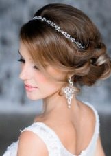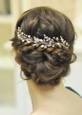 The presented model of laying is ideally suited for festive summer evenings. Hairstyle visually seems light, airy, attracts admiring glances of others. As an ornament, a mesh with beads is presented, ideally in tune with the overall hairstyle style.