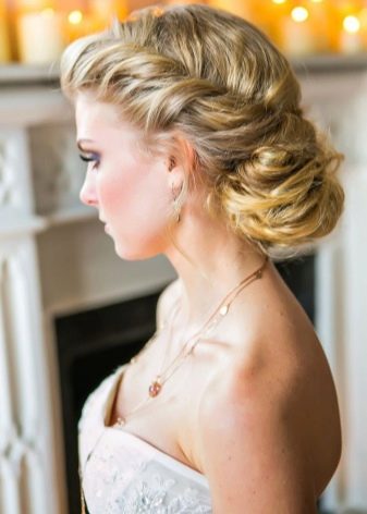 - In the temporal region should capture a small curl and twist it into a flagellum. On the other hand, a similar procedure is required. Connect them on the back of the head stealth. In this case, the curls should be wrapped inside the pile.