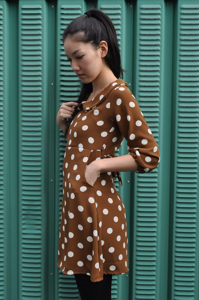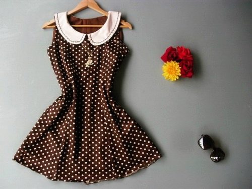 A dress of this tone with white peas will be a good choice for an office. Business women can wear it with a cropped beige jacket, beige boats and a leather beige bag. Having chosen a brown-white coloring of a dress in peas for a business meeting, you can wear a white coat, shoes to match the dress or white classic boats.