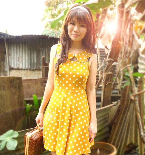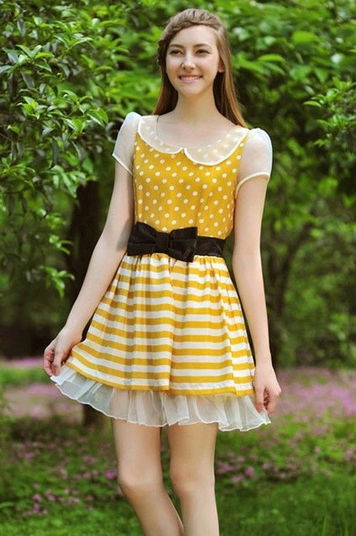The bright yellow shade of the polka-dot dress looks cheerful, so an outfit in this color will be a good solution for a summer walk or a solemn reception. Polka dots on a yellow background can be either light (white or lighter yellow tones) or dark (brown or black). Complement the yellow pea dress with a belt and a bag to match the peas, as well as yellow or black shoes.
