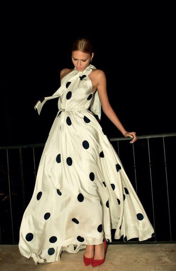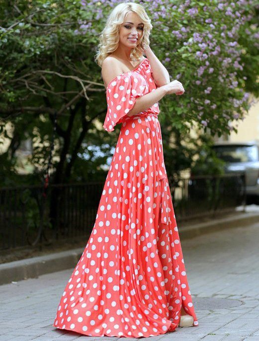 Dresses in polka dots in the floor are usually sewn from flowing light types of fabric, for example, from light chiffon or nice cotton to the body. An elegant dress with a pea pattern in floor-length is most often represented by models from satin. If such a dress is intended for special occasions, it can have a long hem or an elegant slit.