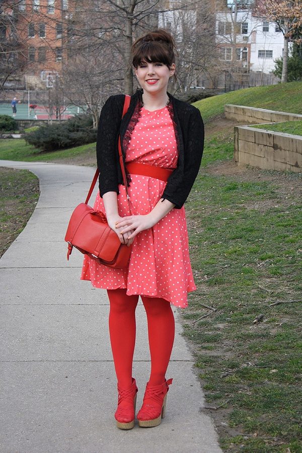 In addition, the red and white colors of the pea dress perfectly fit with the black classic accessories, and wearing such a dress with a wide-brimmed hat and shoes decorated with flowers, you can create a gentle Turgenev look.