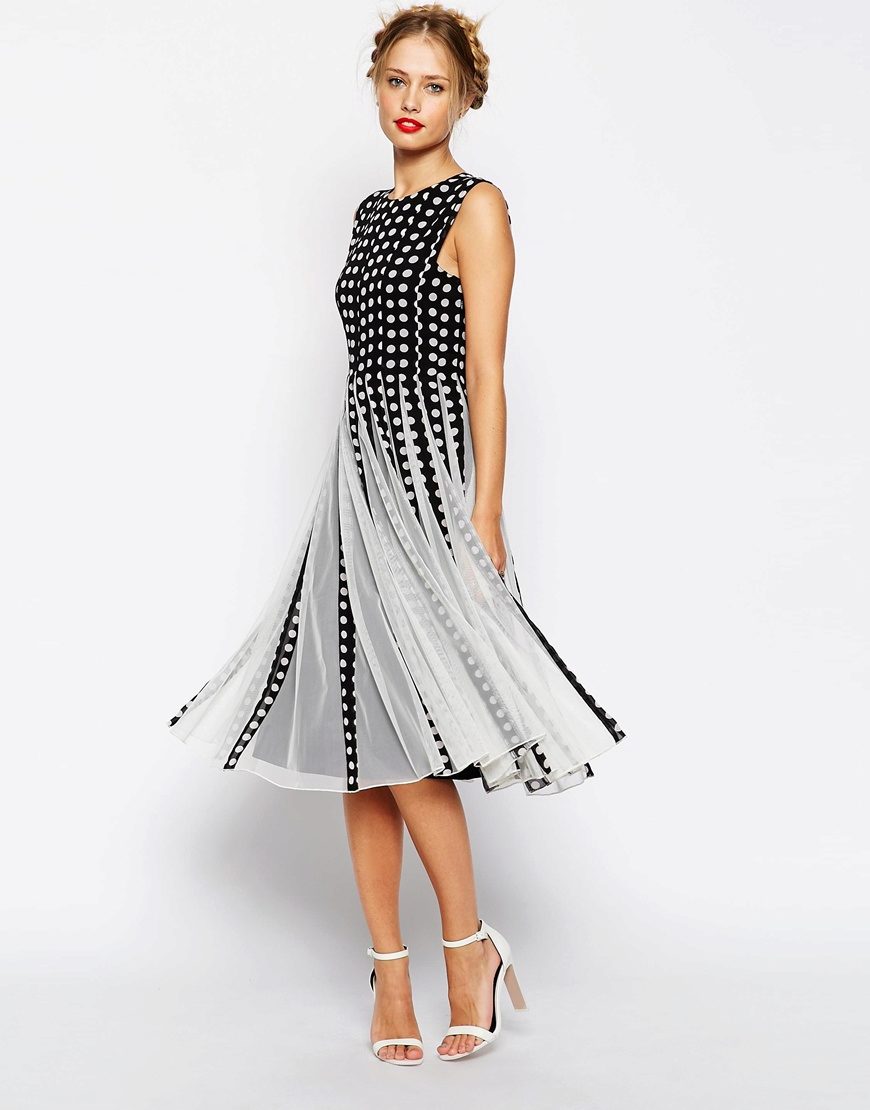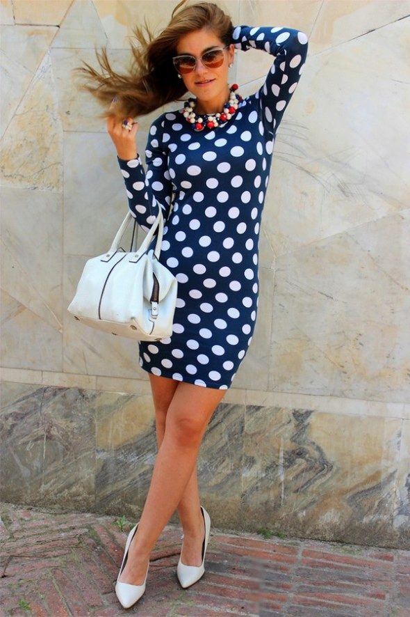Thanks to the large pea print, the figure can be given more volume, and if such a pattern is only in a certain part of the attire, it helps to focus on individual elements, for example, on the bodice of the dress. That is why girls with curvaceous should avoid dresses with too large peas, especially if the base of the dress is white.