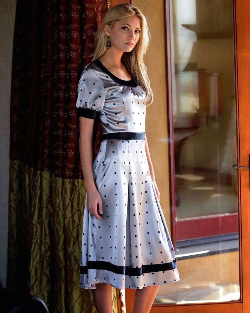 A print with polka dots is presented on different fabrics, which contributes to a large number of variants of dresses in peas. Summer models are made of chiffon, cotton, batiste or poplin. Elegant dresses in peas create mainly of satin, trimming it with tulle, organza or lace.