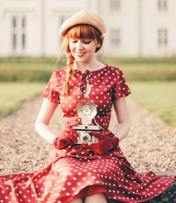 An outfit that has a red background and a white pea pattern is considered the most romantic. This dress is often supplemented with a white belt of different widths, tying it with a bow. Other accessories for this dress are also recommended, either white or red.