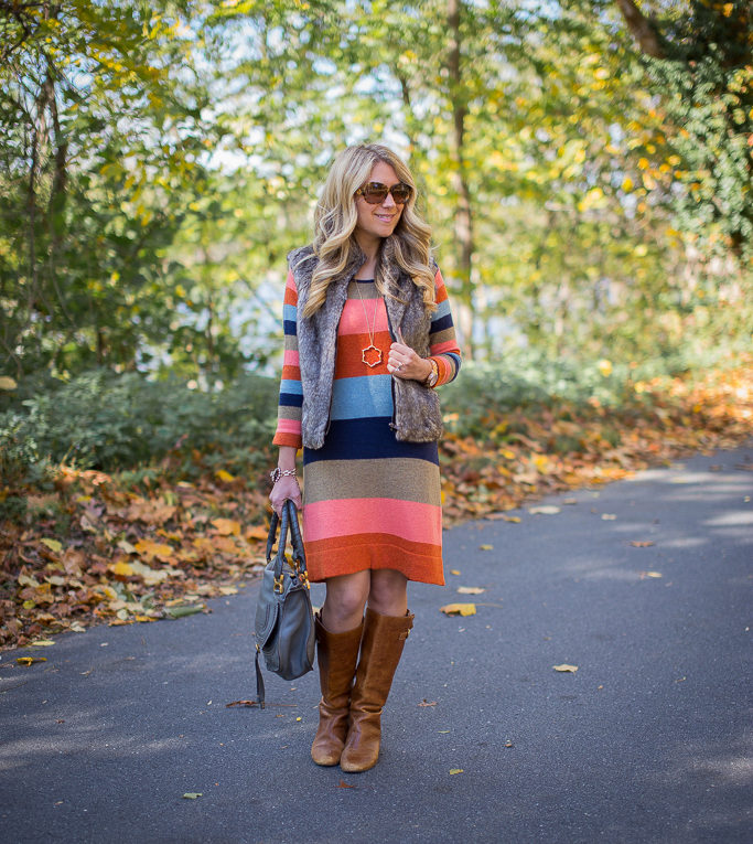 For a multicolored striped dress, on the contrary, pick a one-colored ornament or accessories without too much decoration. As an outerwear with a striped dress, you can wear a leather or denim jacket, jacket, fur vest, raincoat or coat. A good option would be to choose an extra item in one of the colors presented in the dress colors. If you want something neutral and versatile, look for beige or black shoes and a handbag of the same neutral color.