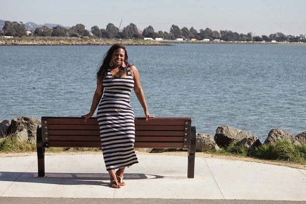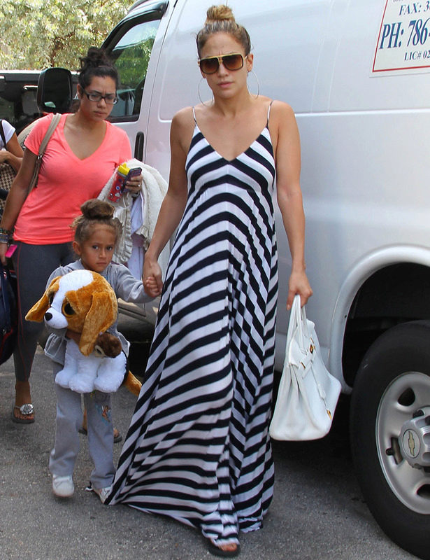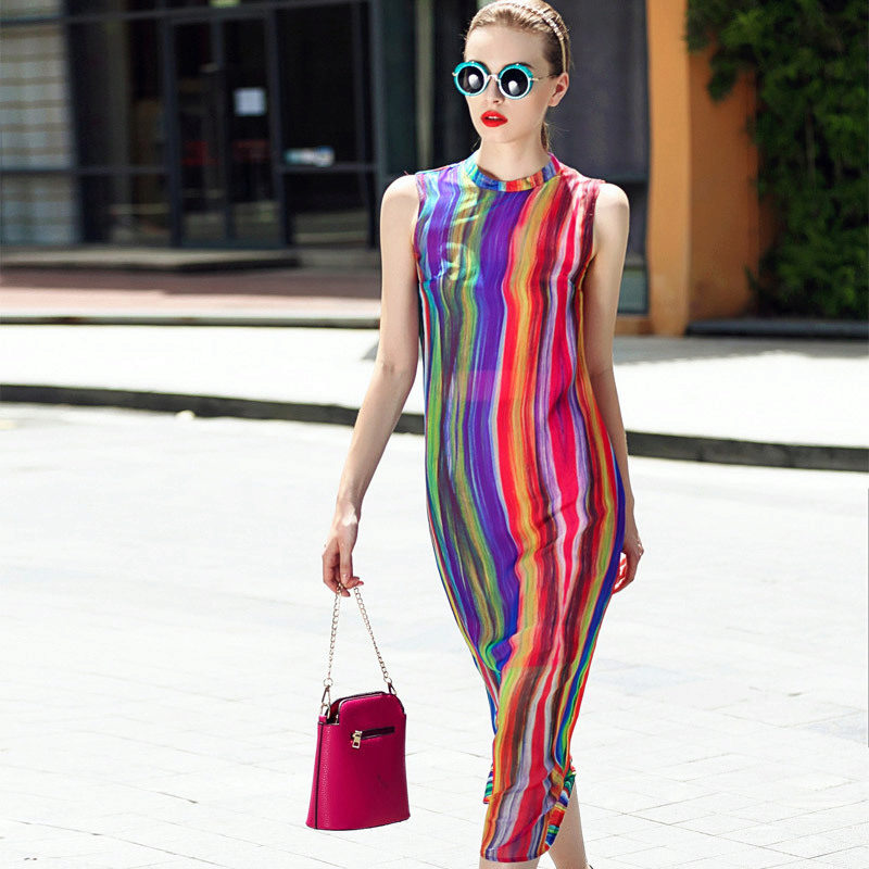 In a striped dress in the floor, the figure looks more slender, especially if the print is represented by a vertical pattern. If the dress is so long that it hides shoes, pick up eye-catching accessories, such as an orange or yellow bag and a set of jewelry from a bracelet and necklace.
