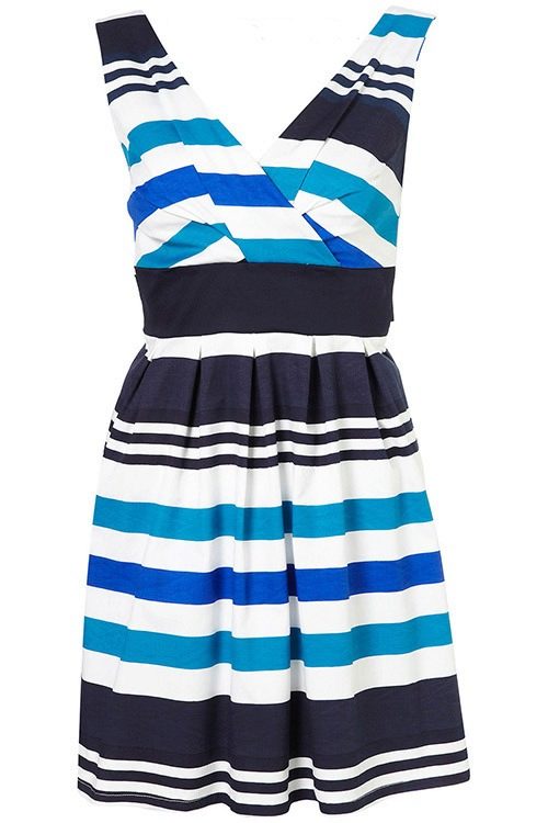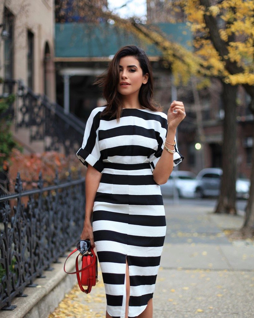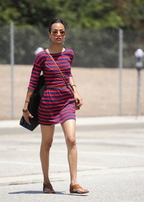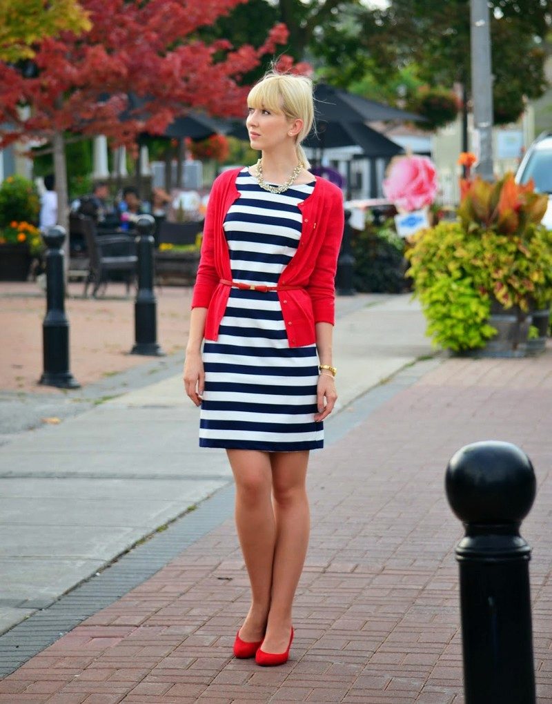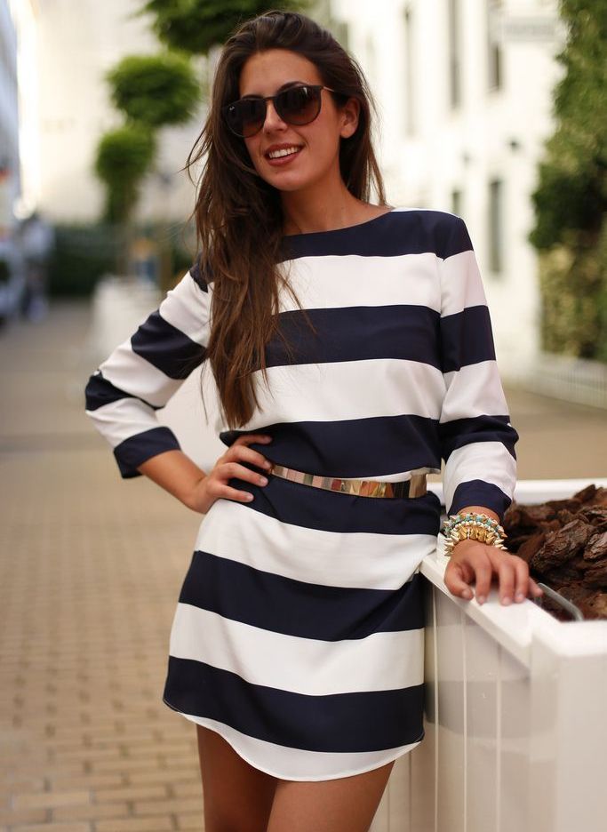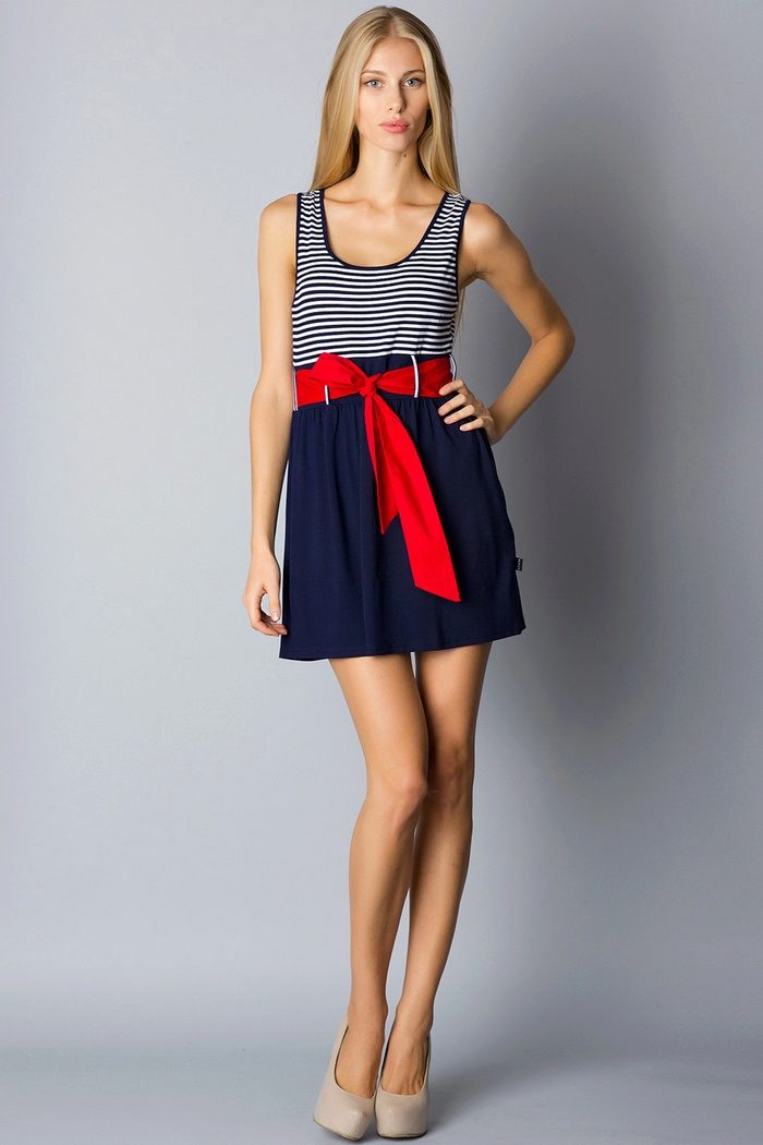 This color combination also refers to the “nautical” style. It looks especially impressive on short dresses. Achieving such a combination is possible with a blue-and-white striped outfit, urasiv it with a wide red belt.