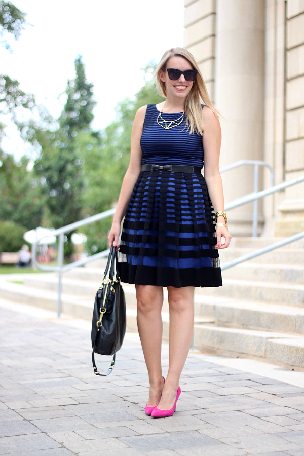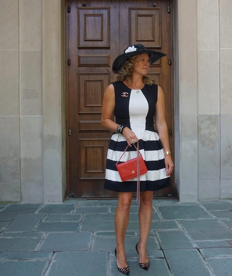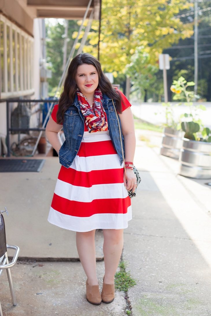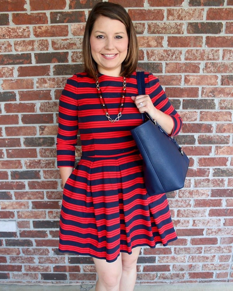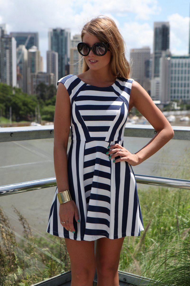 This color combination also refers to the “nautical” style. It looks especially impressive on short dresses. Achieving such a combination is possible with a blue-and-white striped outfit, urasiv it with a wide red belt.