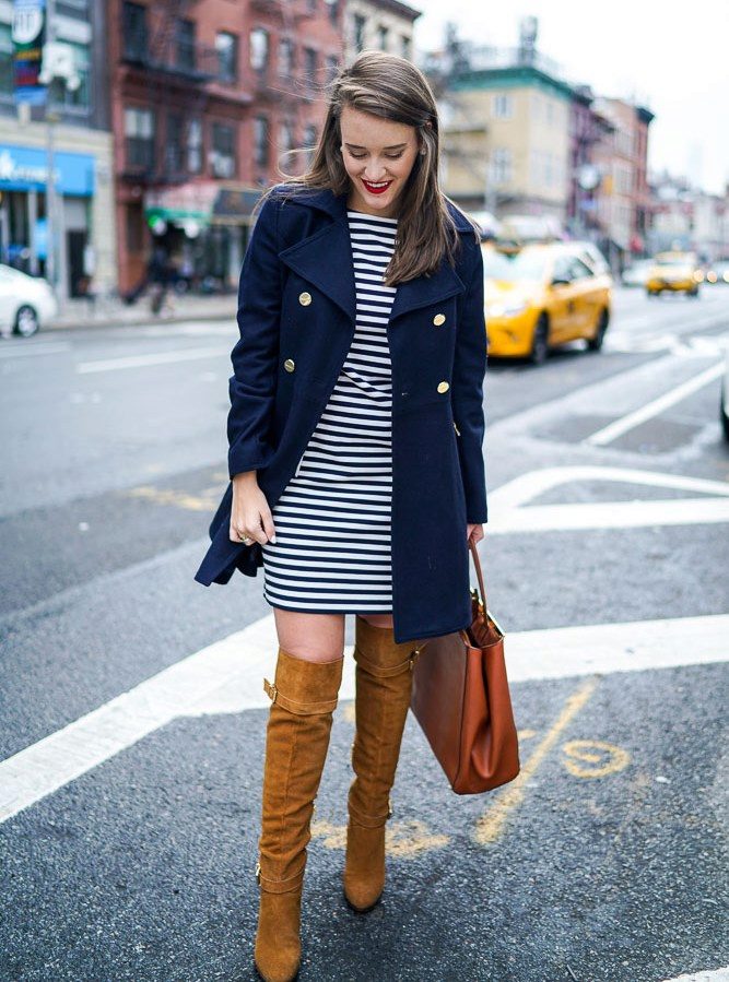 Striped machine-knitted dresses are especially popular in cool weather. The upper part of these dresses may resemble a sweater. Usually, a knitted striped dress has a sleeve of different lengths, and the length of the attire itself is usually average (although knitted dresses with a short skirt are quite common). Wearing a striped knitted dress is advised with boots or ankle boots, and accessories for such an outfit are best selected to be plain.