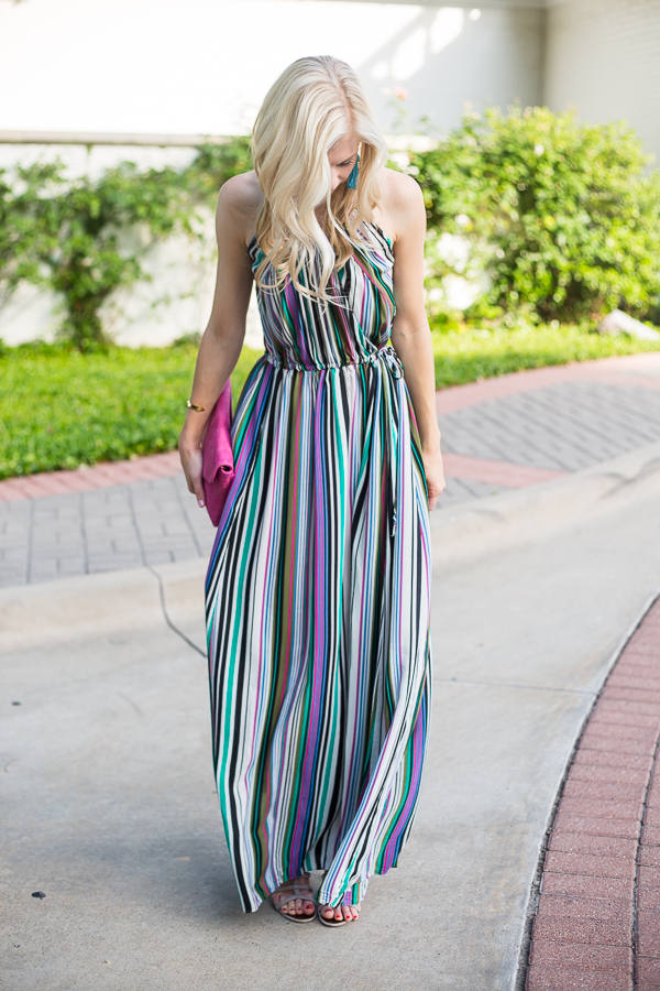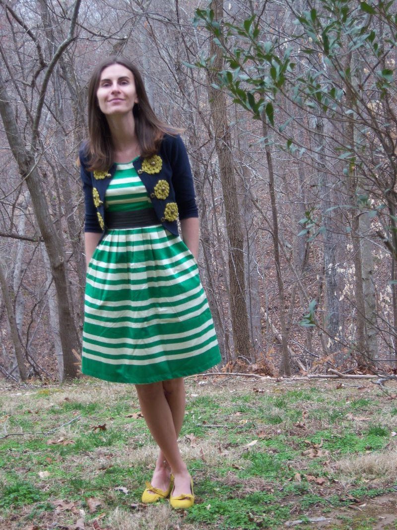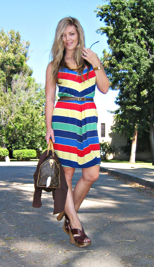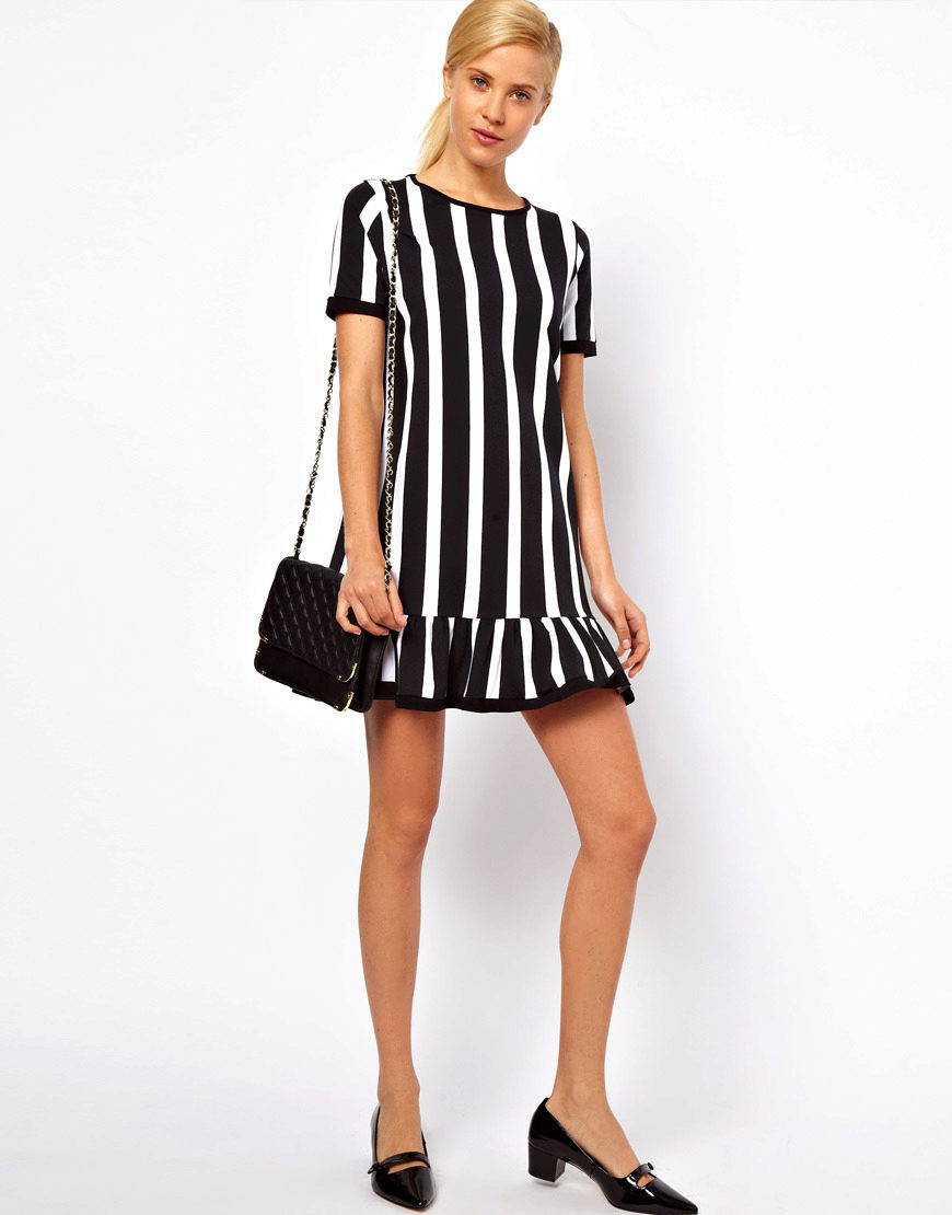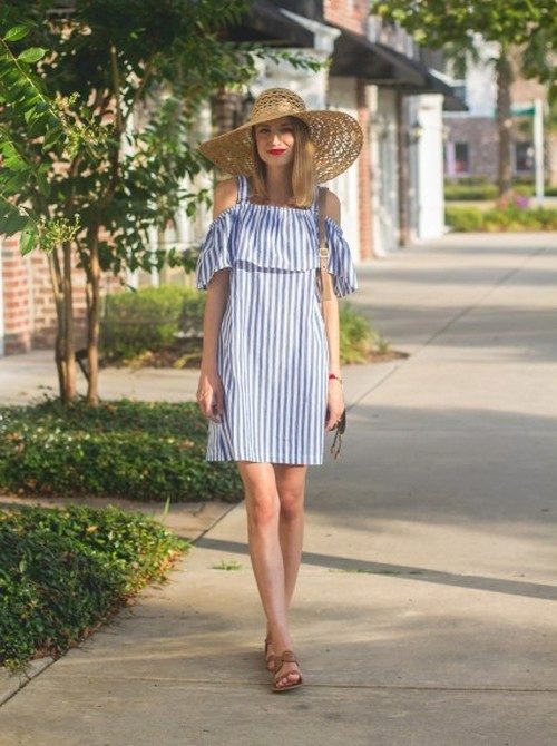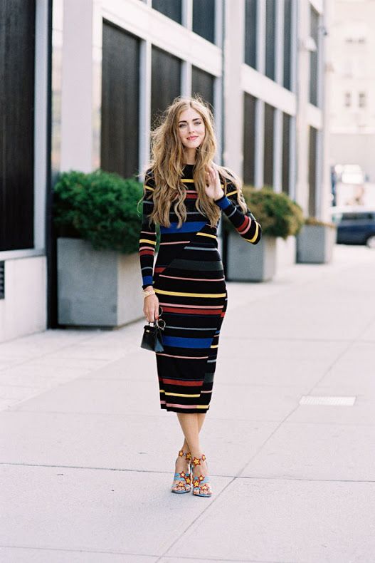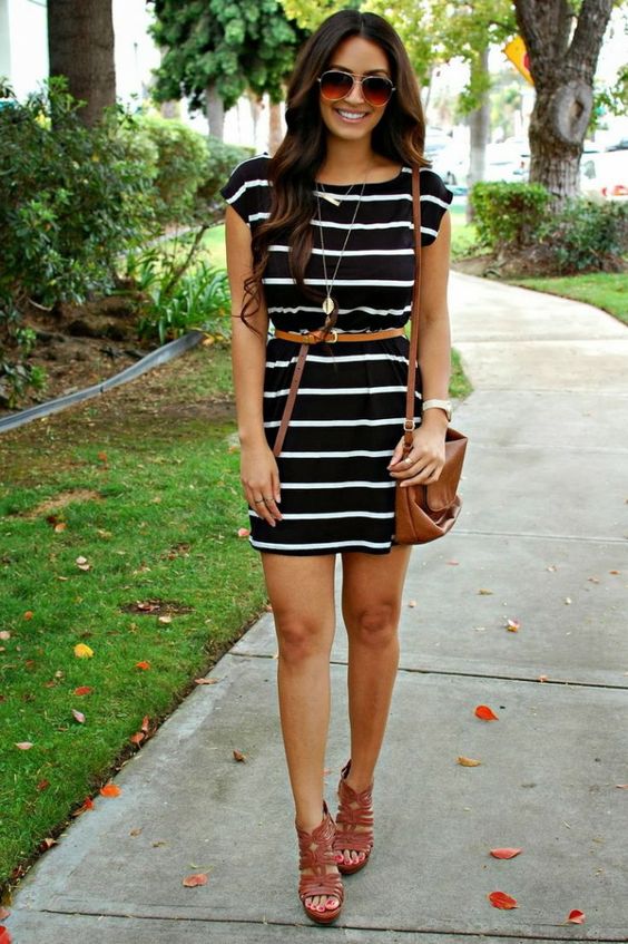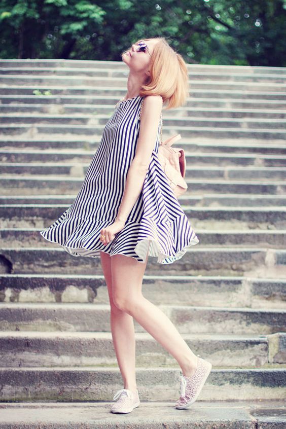 For striped dresses you can pick up sandals with square heels or stiletto, sneakers or wedge sandals, ankle boots, ballet flats, pumps, sandals or boots.