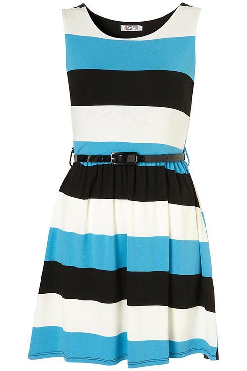 Such a "sea" combination is often used in modern fashion. Dress in a strip of these shades will be a stylish outfit for walking around the resort town or going to the beach. A thin black lacquered belt, as well as accessories in white or blue color will suit it.
