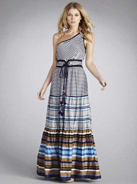 As we have already mentioned, the use of horizontal stripes adds volume, so the outfit in such a strip of medium length or floor is advised to wear only slender young ladies. If a monochrome dress has several horizontal stripes on the chest, this will visually add to the volume of the bust, and placing such bands on the hips will emphasize the sporty figure.