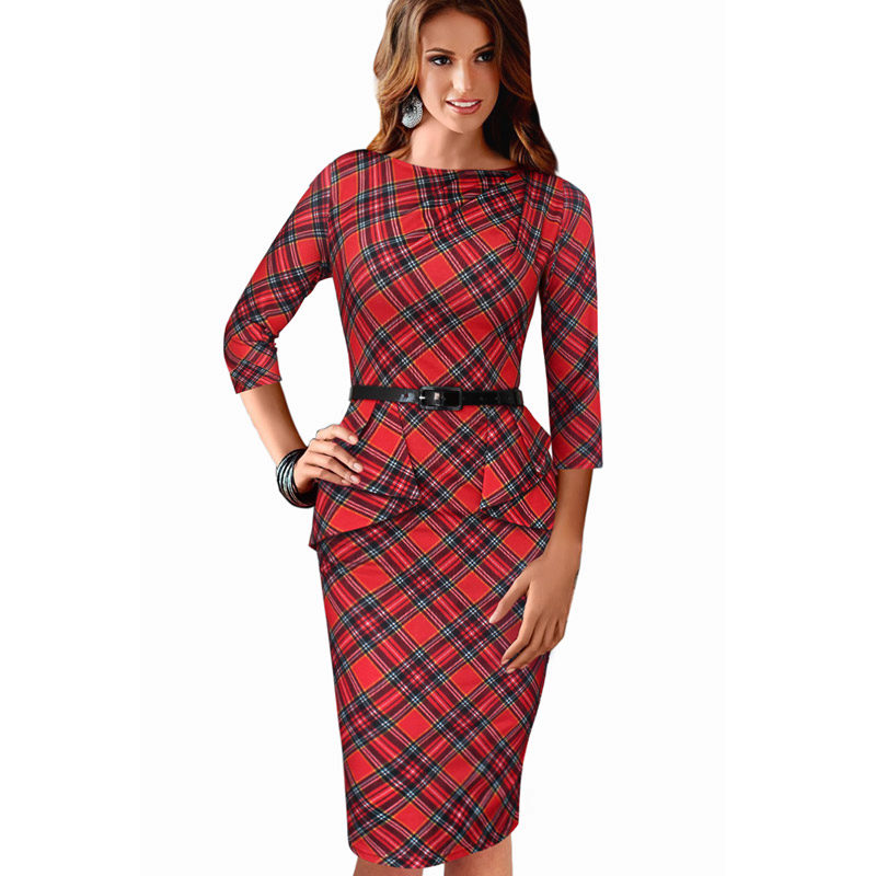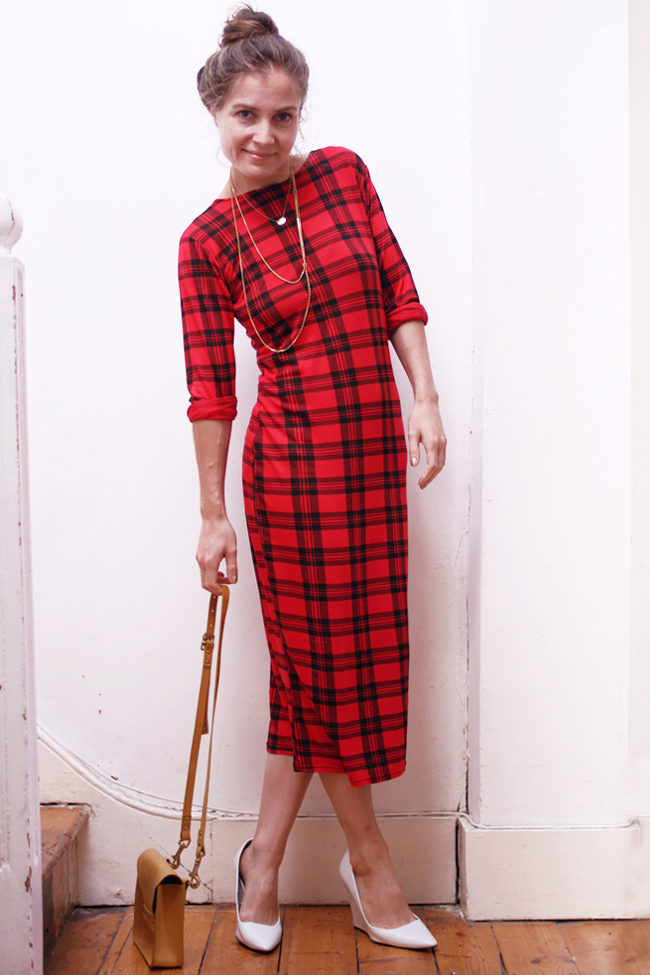 A long, closed check dress is an excellent option for work. Firstly, it meets all the rules of the established dress code, secondly, you will always be in the spotlight. The red color of the fabric will attract the enthusiastic looks of others.