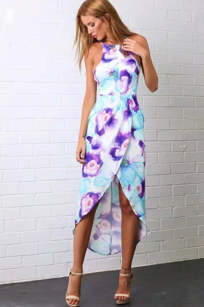 A colorful cocktail or evening dress with a floral print will be a wonderful choice of dress for the holiday. It will look especially spectacular if the tone of the print is contrasted against the main background of the canvas. Along with the popularity of floral print, other floral motifs, such as twigs or leaves, look equally attractive.
