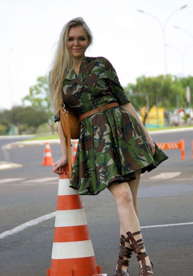 For example, a camouflage dress can be worn with a black leather jacket or with a gray classic coat. Femininity can also be added to such a warlike image with shoes or jewelry.