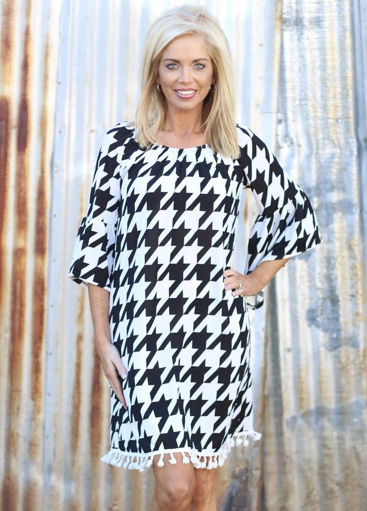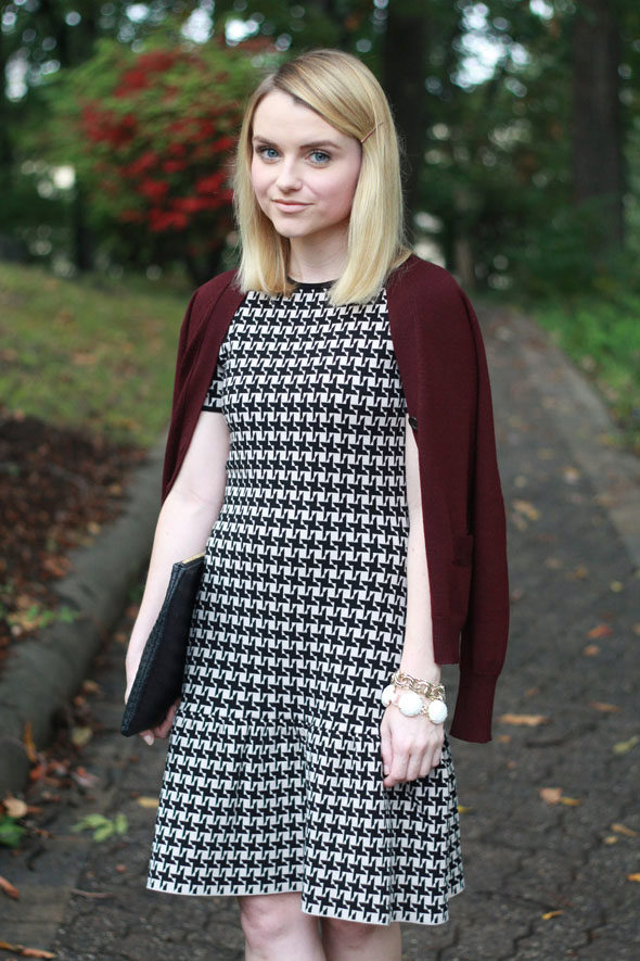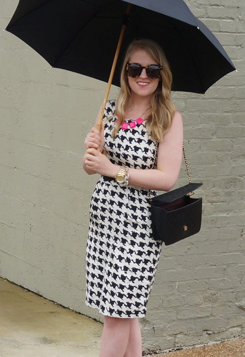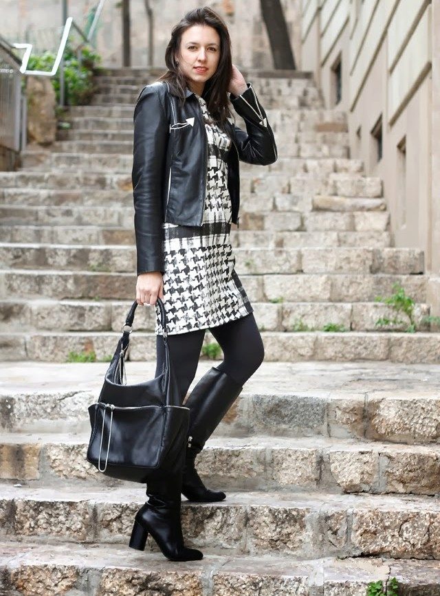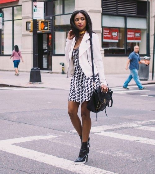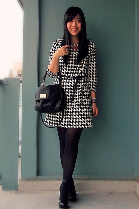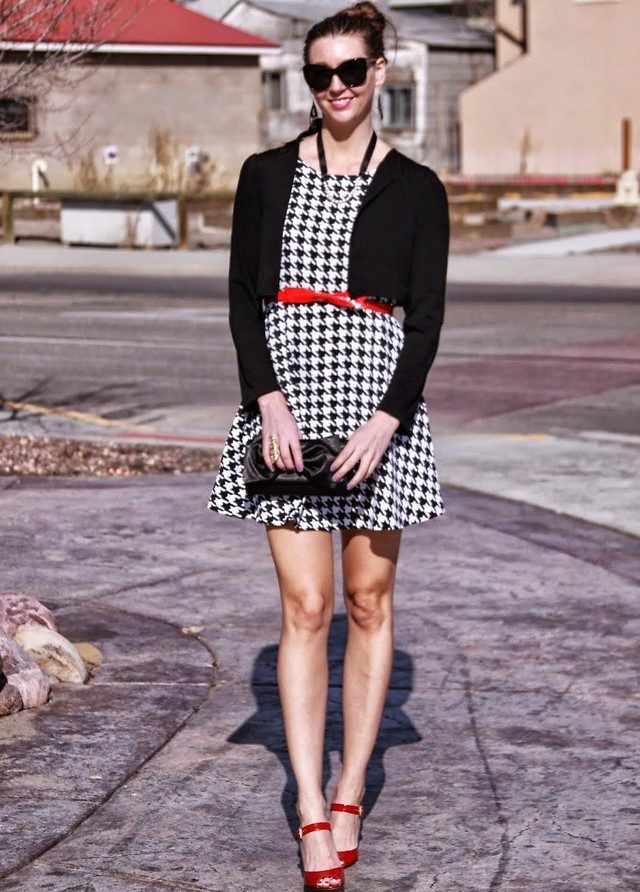 Large accessories in bright colors, for example, red or orange, are successfully combined with a black and white houndstooth dress. Also, along with this, you can pick up white or black accessories.
