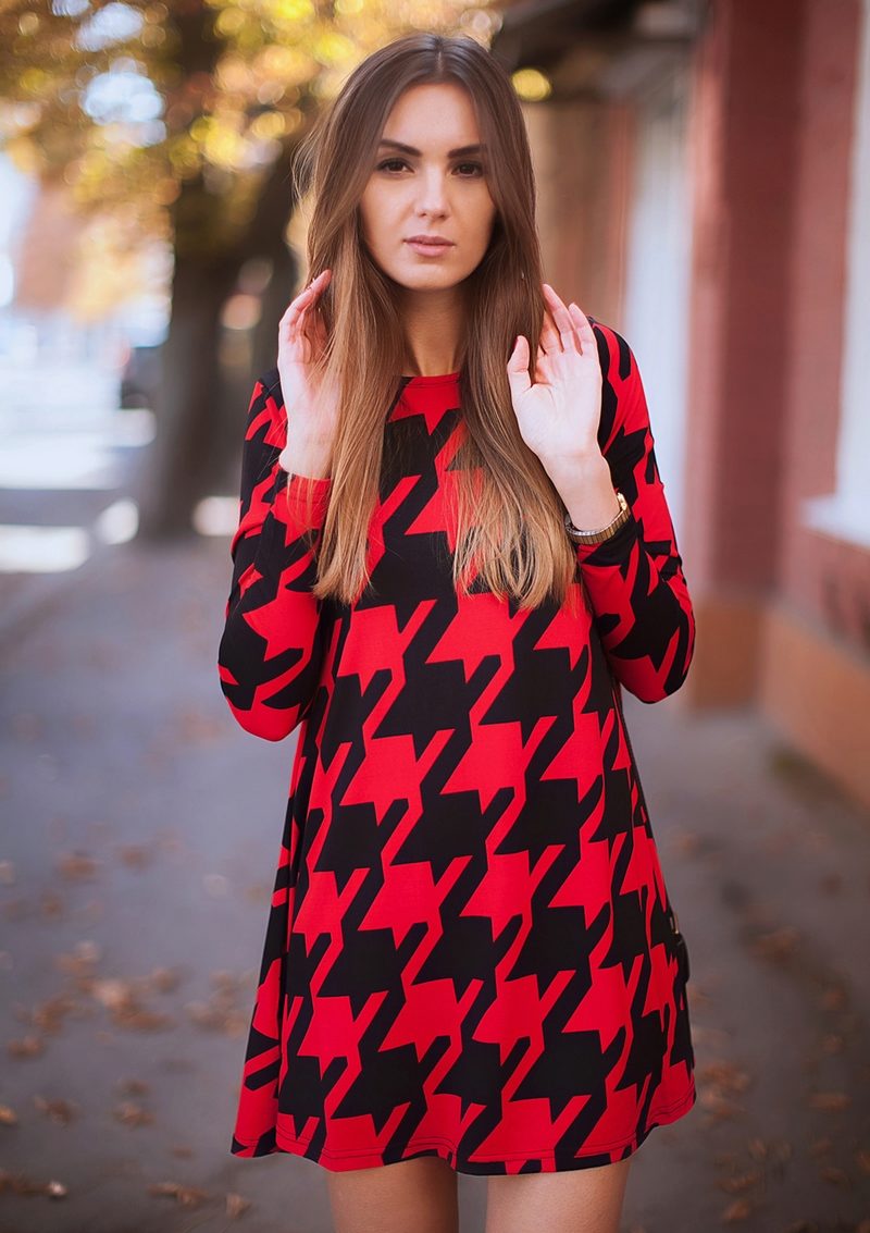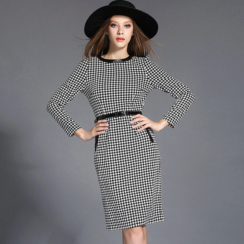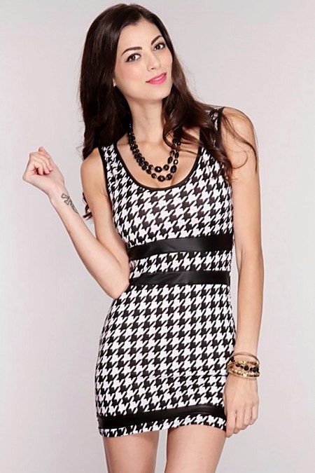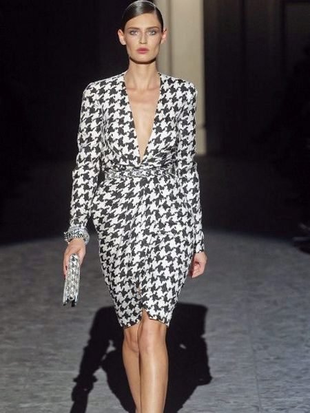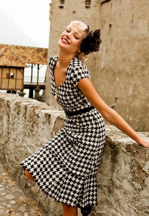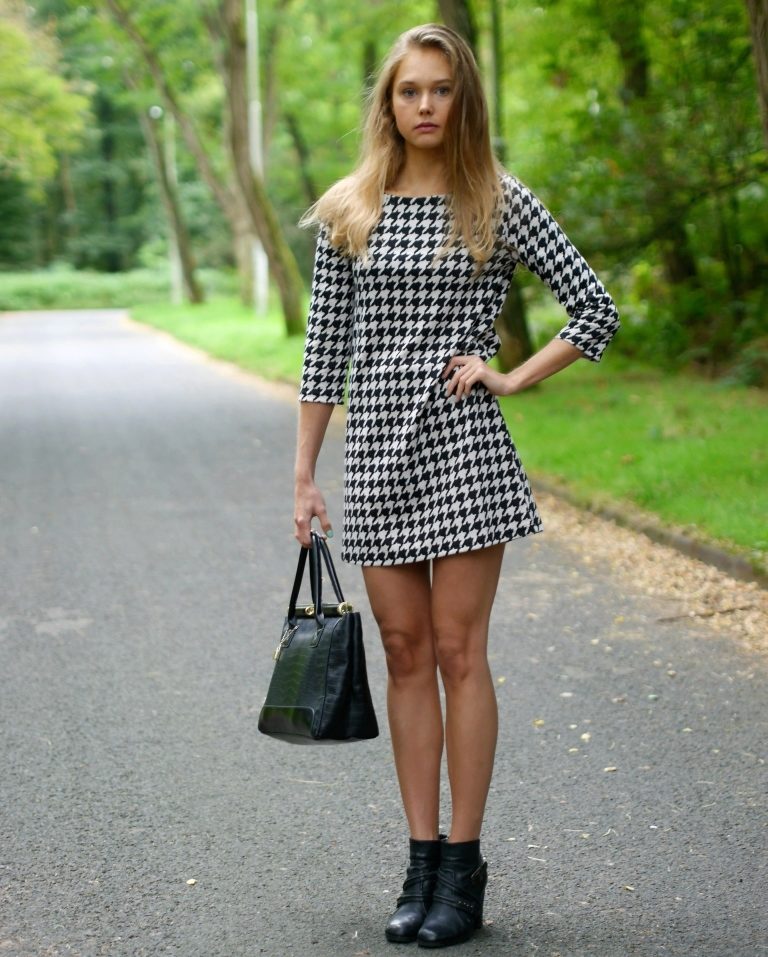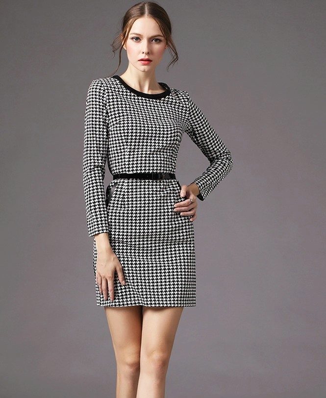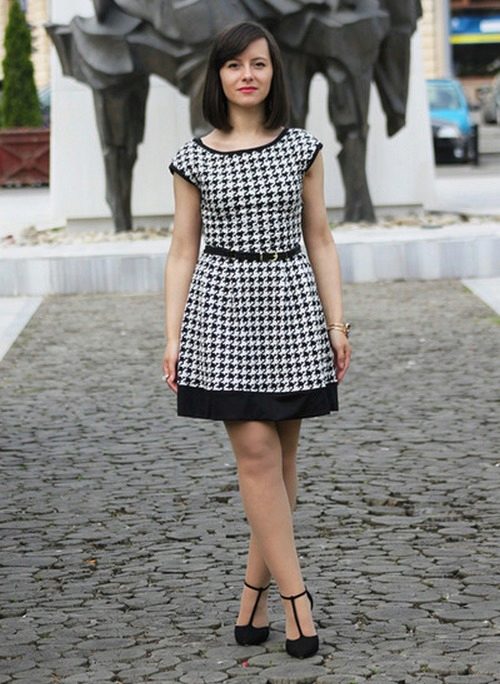 Properly chosen dress with a goose foot print helps to hide figure flaws. In such a dress, full girls, if they choose a small houndstooth, will look more slim, attractive and feminine. And thanks to the use of a large pattern, you can add a volume to the shape.