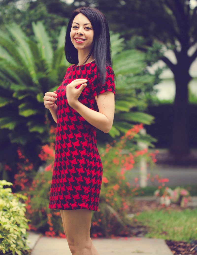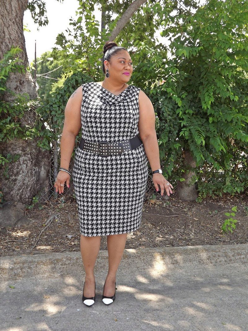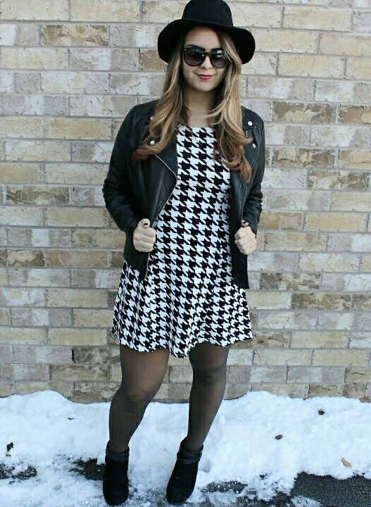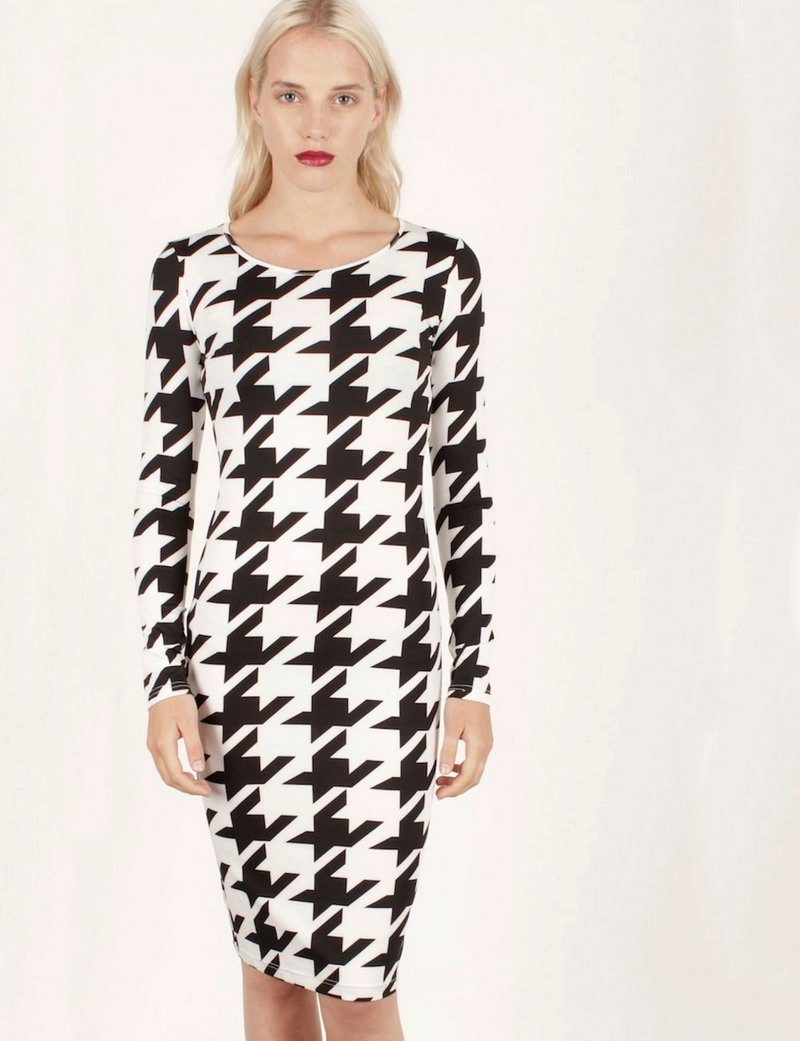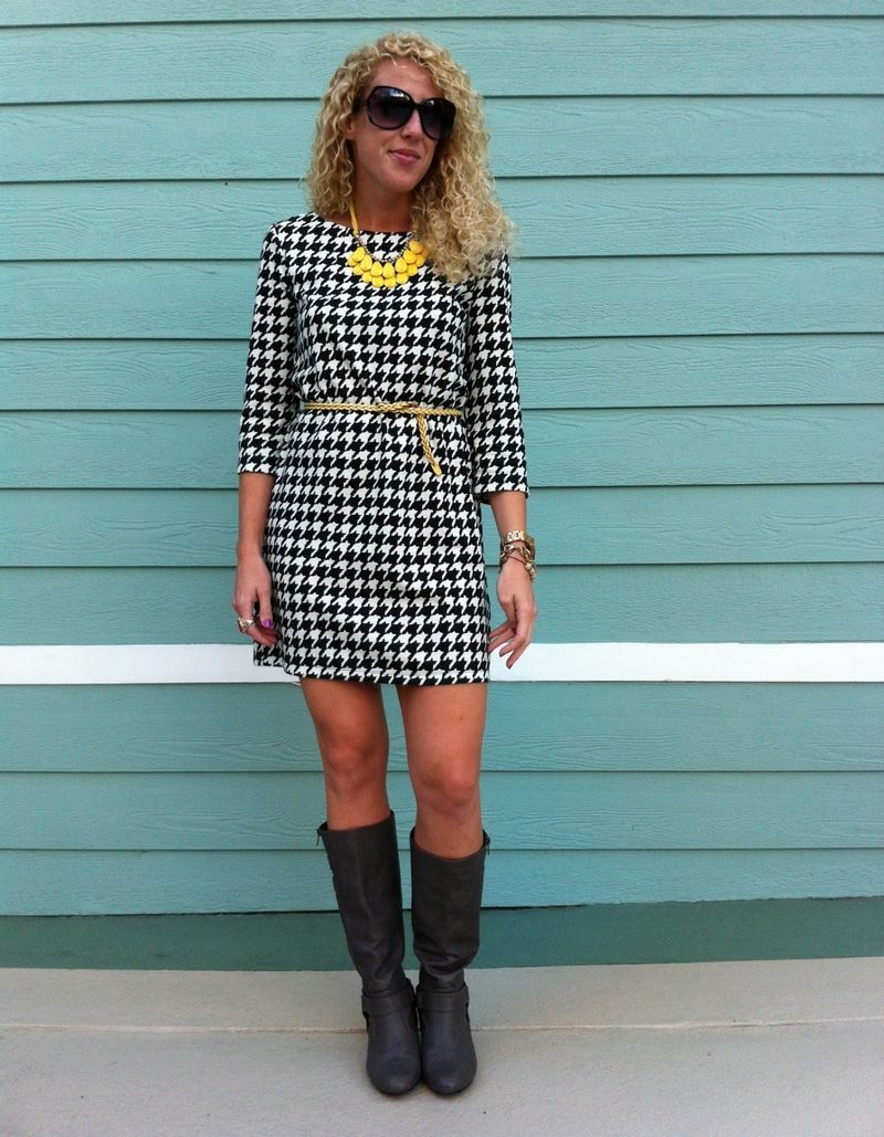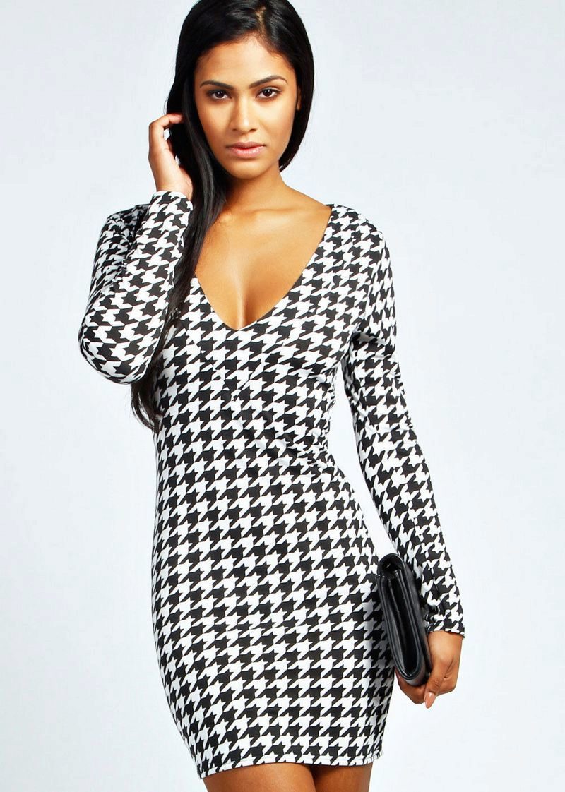 Properly chosen dress with a goose foot print helps to hide figure flaws. In such a dress, full girls, if they choose a small houndstooth, will look more slim, attractive and feminine. And thanks to the use of a large pattern, you can add a volume to the shape.