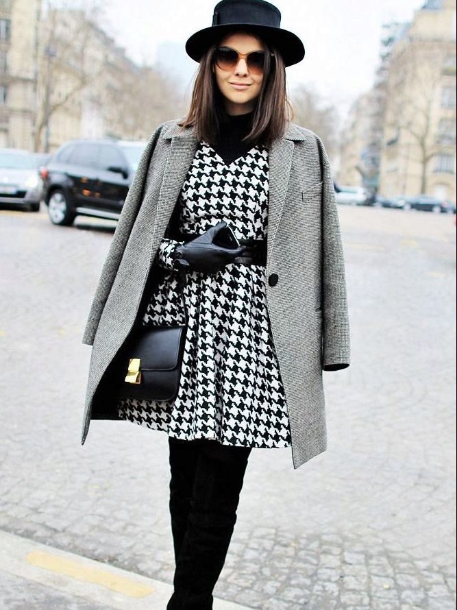 A houndstooth outfit with a miniskirt looks laconic and attractive. Such dresses can have a strict cut or loose volumetric skirt. It is interesting to look at such a short dress with openwork sleeves or with a contrasting collar. Some models may not have sleeves or be made from another fabric.